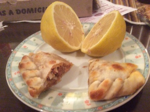 お肉のエンパナーダを二つに切って、レモンをその間に流し込んでいただきます!!!