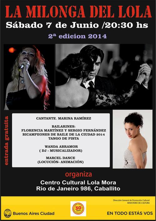 来る6月7日(土)午後8時半からブエノスアイレス市ローラモラ文化センターにてマルセラ先生のレッスンの後、マルセルダンス主催のミロンガあり、入場無料だそうです。