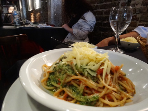 pesto という緑のバジル系のソースに赤いトマトソースがミックスされています。
