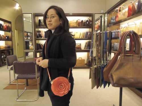 小さなお花模様のカバン素敵な色ですし、ショルダーの長さもですから、モデルになってもらいました。