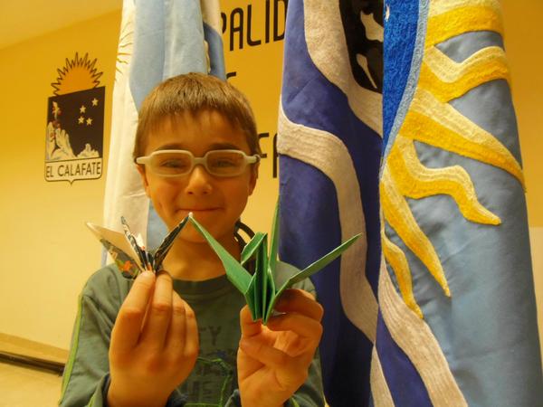 (一番最初に折り鶴に挑戦したカラファテの少年 マテオ君7歳)