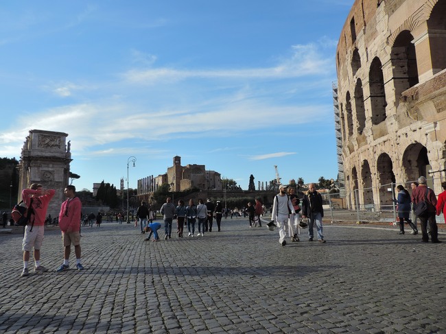 昔の人にとって、コロッセオは巨大で存在自体がミラクルだった訳ですが、今見ても単純に大きいなぁと感心します。今日もたくさんの人がコロッセオを訪れていました。写真右側はコロッセオの南側面、写真中央は古代の政治と文化の中心地、フォロ・ロマーノ(の遺跡)です。