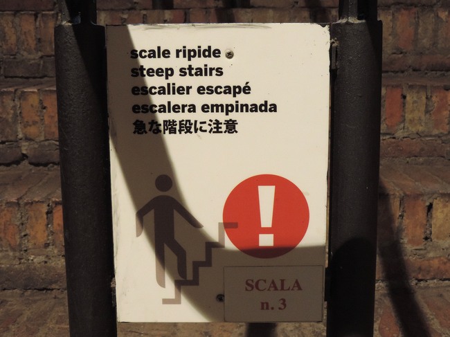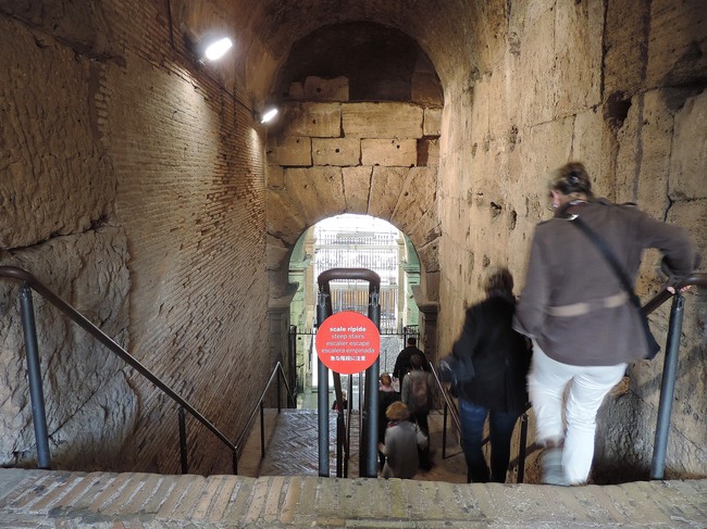 ↑ 階段を上ります。日本語でも注意がありますが、コロッセオの階段は急で、足元をしっかり踏ん張りながら歩かないと、コントの様に後ろにつんのめり返りそうになります。