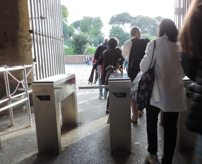 入口の列は、切符購入者用と切符を既に所持している人用(コロッセオの入場切符はフォロ・ロマーノ&パラティーノの丘との共通券なので、フォロ・ロマーノの切符売り場など別の場所で切符を買って所持している場合、もしくはローマパスの所持者)の2つに分かれています。