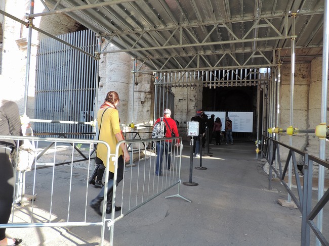 2013年から修復作業に入り、常にどこかに作業用の足場がかかっているコロッセオですが、今はちょうど入場口の上辺りの作業を行っています。よってこの写真でもある様に、入場口も足場で囲まれていて、現在入口が少し分かりにくくなっています。
