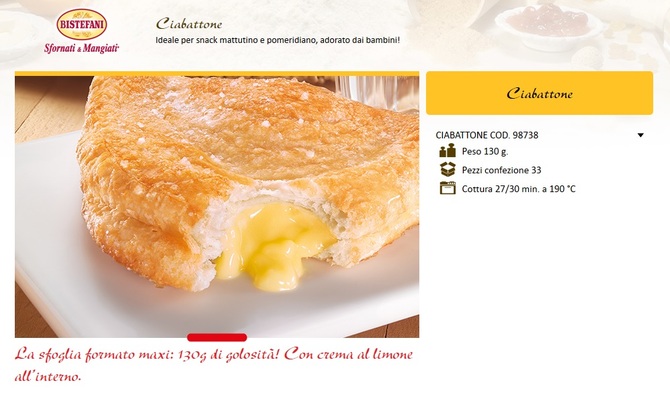 ↑ イタリアではハートのマークでおなじみの、ユニリバー・イタリア(Unilever Italia)のアルジダ(Algida)シリーズのフード・サービスでもチャバットーネを売っていました。朝食向けの商品のコーナーで、130gのパイの中にはとろりとしたレモンクリームが入っているとあります。これはまたおいしそうですね。