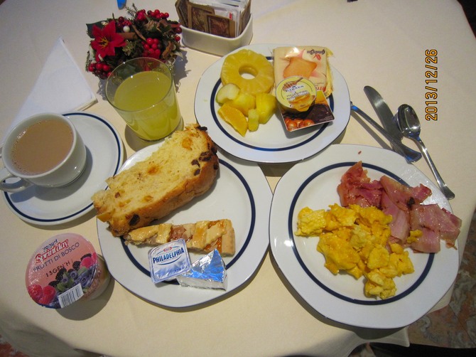 ↑ ローマの3つ星ホテルの朝食の一例。