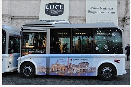 ↑ 新しく登場した、無料の電気ミニバス “フリー・ローマ・パス” です。バスの装飾もクリスマス用になっています。