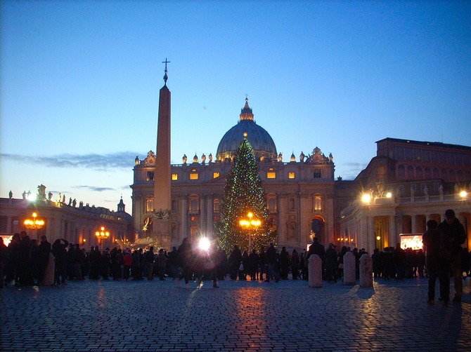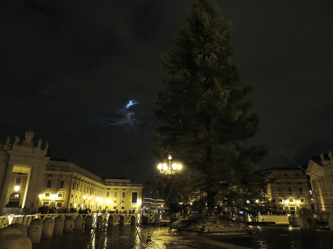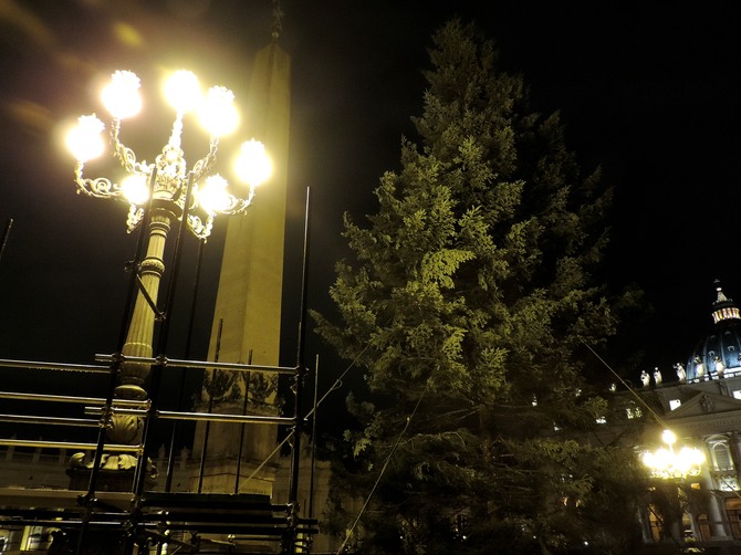 本物のモミの木で、今年は南イタリアのカラブリア州からやって来ました。高さは25メートルもあります。モミの木は毎年、違う場所からやって来ます。近年では、2013年はドイツのバイエルン、2012年はイタリア中部のモリーゼ州から切り出されたモミの木をツリーとして使用しています。これから1ヶ月間、皆を楽しませる為、頑張ってくれる生の木です!