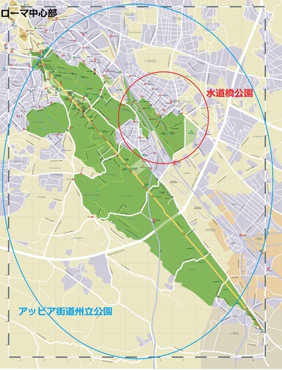 ↑ 水道橋公園は、大きなアッピア街道州立公園(Parco Regionale dell’Appia Antica)の一部です。水道橋公園内には、ローマ水道11本のうち6本が公園内を通過しています。ずっと後の16世紀に、ローマ教皇シクストゥス5世が建設したフェリクス水道を加えれば7本もあります。