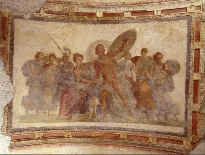 ↑ “黄色の天井”といわれるお部屋。ドムス・アウレアは、ルネサンス時代の画家達を大いに魅了しました。彼らは遺跡の壁などにサインやデッサンを残しました。デッサンは赤土色の線です。(サングイーニョ Sanguigno といわれる赤土色のデッサン用のパステル)