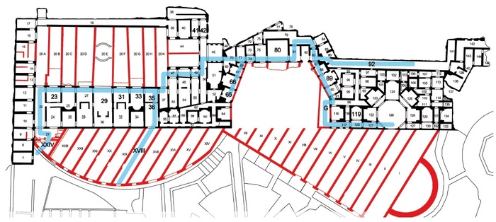 マップ上の赤線で模られている部分は、後にトライアヌス帝がトライアヌス帝の浴場を造った部分の遺構です。(トライアヌス帝は104年頃に、ネロ帝の黄金宮殿の基礎部分を一部、使い回して建てました。要は経費削減にも良い、リサイクルです。)
