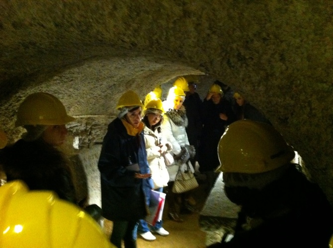入場は全員、かわいらしいヒヨコの様な真っ黄色のヘルメット着用で、内部の15の区間を考古学専門のガイドさんと75分かけてじっくり廻ります。余談ですが、ヒヨコヘルメット着用時に記念撮影をしておくと、後で楽しい思い出になります(?)。