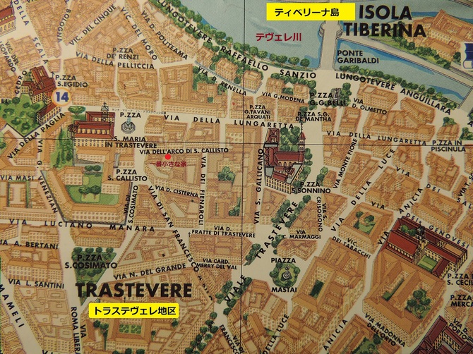 ↑ “ローマで一番小さな家”といわれている家があるトラステヴェレ地区(Trastevere)の名前は、”向こう側”という意味の”Trans” と、ローマ市内を流れるテヴェレ川の “Tiber (Tevere)” がくっつき、”テヴェレ川の向こう側”という意味を持ちます。