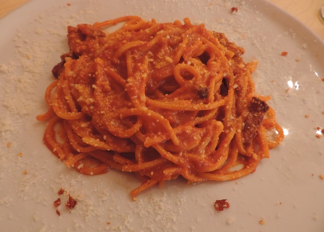 ↑ 別のお店のアマトリチャーナです。麺をブカティーニではなく、トンナレッリにしてもらいました。トンナレッリ(Tonnarelli)とはイタリア中部で良く食べられるパスタの一種で、麺の断面が四角(◆)です!(1枚前の、ブカティーニのアマトリチャーナの写真と見比べると、麺が四角いことが分かるかもしれません。)