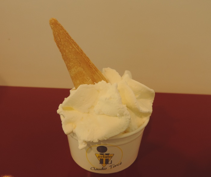 イタリアでは、ジェラートの上に生クリームがついてきます。(一般的に追加料金はなし) 生クリームがいっぱいで、肝心のアイスクリームが見えなくなってしまいました!