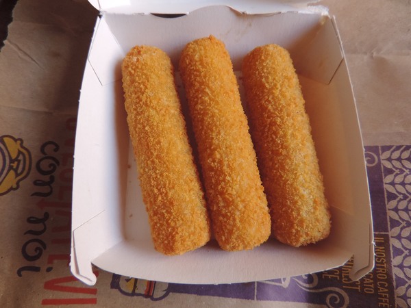 ↑ ところが、味はどこにでもあるフライではありませんでした。プロヴォローネチーズのフライなのでもちもちのチーズが強烈です。魚肉ソーセージ(?)の様な歯ごたえです。味がしっかりしているので、ケチャップをつけなくてもおいしいと思います。昨日のパンツェロッティより気に入りました。3本入りで2ユーロ、カロリーは245kcalです。