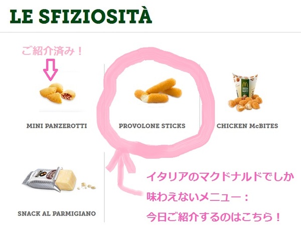本日も、マクドナルドのイタリア限定メニューに、また別の種類のフライを見つけましたので、ご紹介したいと思います。プロヴォローネ・スティック (Provolone Sticks)といいます。 このプロヴォローネというのは、イタリアのチーズの一種で、牛のお乳から作る真っ白な硬質チーズです。