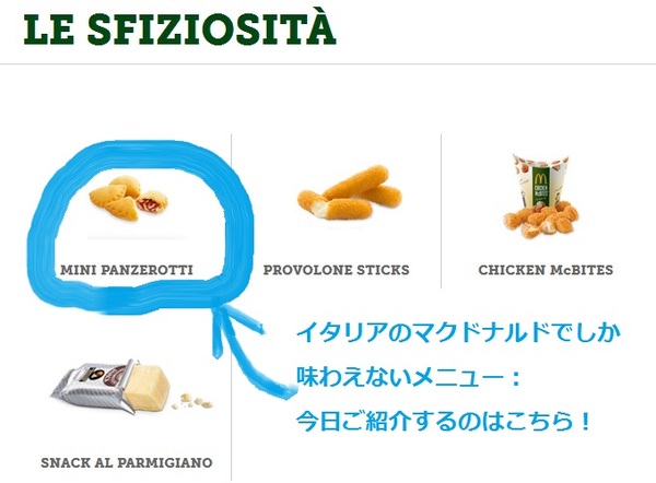 今回のテーマは”フライ”ですので、マクドナルドのメニューにある、フライ系のものを探してみました。全てイタリアでしか食べられない限定メニューでした。そのうちのいくつかをご紹介したいと思います。