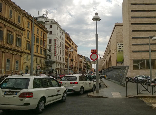 ↑ こちらはテルミニ駅の北東側(マルサラ通り)のタクシー乗り場です。白いタクシーがお客さんを待っています。オレンジ色の看板がタクシーステーションの目印です。