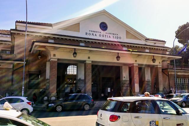 ↑ 地下鉄B線ピラミデ駅と連結している、ローマ=リード鉄道線が発着するポルタ・サン・パオロ駅。 ここからローマの海、オスティアまで行くことが出来ます!手前に停まっている白い車達がローマのタクシーです。