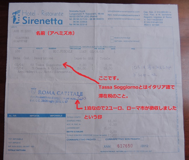 ↑ 昨年宿泊したホテルの領収書なので、課税額は変更前の一人一泊2ユーロが適用されています。(ホテルをジロリとチェックする為の見苦しい宿泊メモがありすみません。こっそり書きますとお奨めホテルです。)