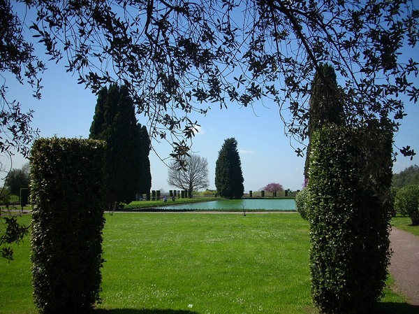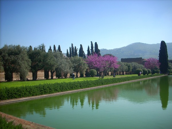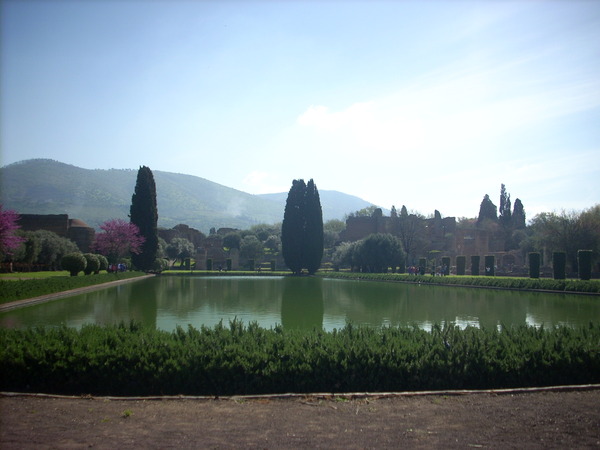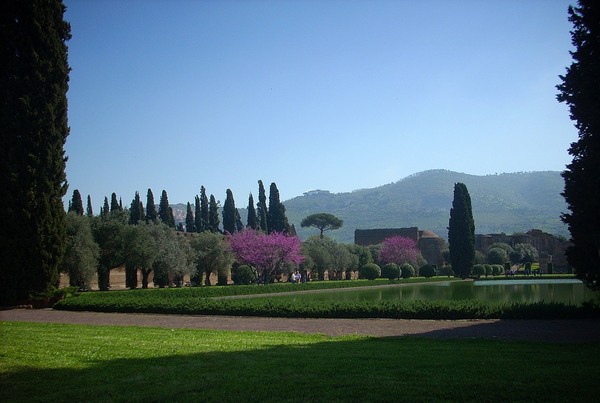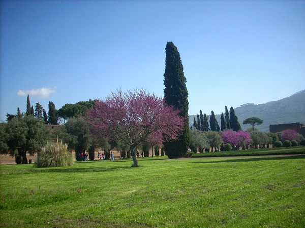 ↑ この濃いピンク色の花をつける落葉灌木です。写真はローマ近郊の世界遺産、ヴィッラ・アドリアーナ(ハドリアヌス帝の別荘)です。