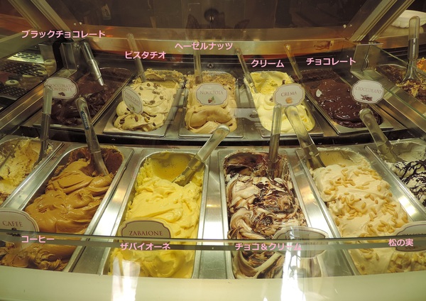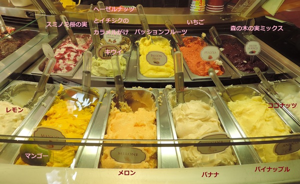 ↑ こちらはフルーツ系です。今日は気温が29度ありとても暑かったので、このさっぱり系のジェラートを食べようかとしばし迷いました。さっぱり系とは言葉ばかりで、写真中のヘーゼルナッツ&イチジクのカラメルがけというアイスに強烈に惹かれます。
