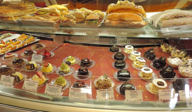 スイーツに限らずプロセッコ(ブドウからとれる発泡性のワインで写真中の縦長グラス)やグラスワイン、ビールなどのアルコール類も充実しているので、夕方になるとアペリティーヴォを楽しむ人達がたくさんやって来ます。