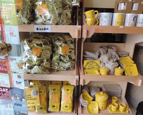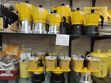 ↑ 上段は、コーヒーを入れるモカ(ガスコンロに置く、ポットのような形をしたエスプレッソ・コーヒーの沸かし器)もこのお店のオリジナルです。これを持って帰ると日本でも飲めますね!