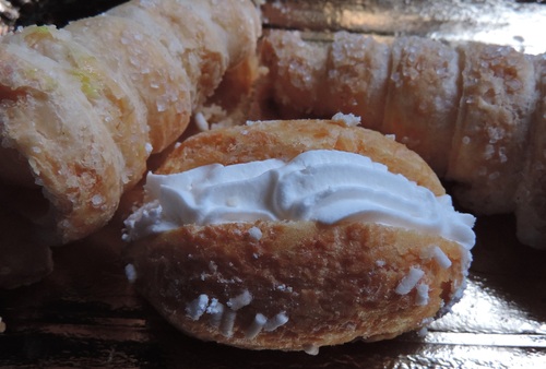 ↑ こちらはカンノーロ(Cannolo)という筒型のスイーツで、この写真のものは中にクリームが入っています。こちらも人気のスイーツなので、人様のお宅へお邪魔する際などに持参の場合、カンノーロもいくつか入れてもらうことも多いです。女性はクリームが苦手な人が結構多いので、用心の為に、チョコレート、ホワイトチョコレート、ピスタチオクリームなどを混ぜておくと無難です。