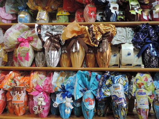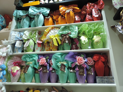 ↑ イースターにプレゼントするチョコレートの卵です。大きな卵は乳幼児位の大きさがあります。