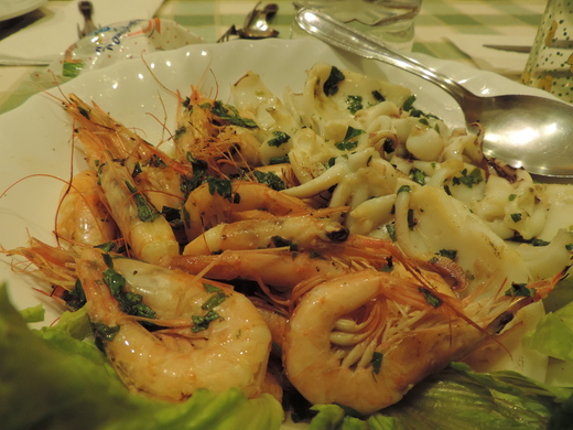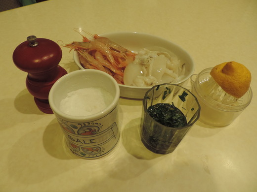 ↑ エビとイカが焼けたら、オリーブオイル、イタリアンパセリ、レモン汁、塩少々、黒コショウ少々を混ぜたソースであえるだけです。