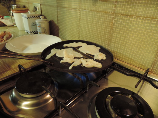 ↑ 鉄板の上で油をひかずに焼きます。焼きすぎるとイカは固くなるので手早く行います。