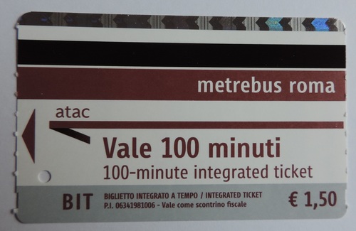 この切符はATAC (アタック 詳しくは過去記事)が発行するローマの市バス、地下鉄、トラム、鉄道に使用できる切符の1回券(普通切符)でお値段は通常通りの1枚1.5ユーロです。