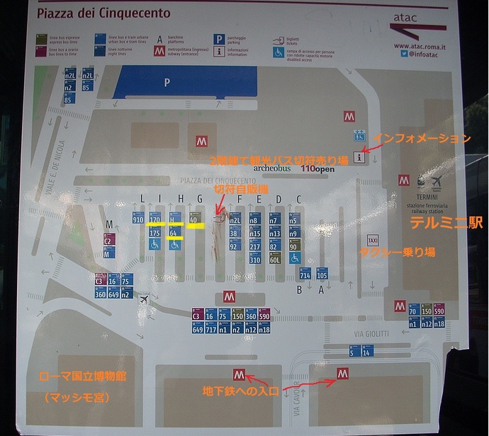 今回はローマ中央駅テルミニ駅前の五百人広場のバスターミナルのバスの乗り方を、最新のバス発着ホームの路線番号表を併せてお届けします。
