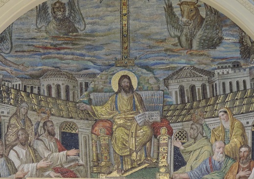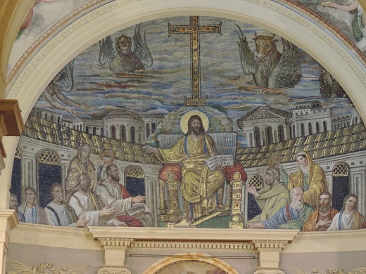 どちらがいいとか悪いとか、美しいとか醜いとかの問題ではなく、中世特有の表現方法なのです。これは、サンタ・プデンツィアーナ教会のあのドラマティックなモザイクから約200年後に作られたモザイクですが、ここにはもうあのドラマティックな表現はありません。登場人物の数も大幅削減!です。