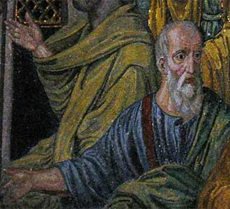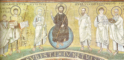 モザイクが作られたのは、ローマ教皇のイノケンティウス1世の在位期間だと壁の奉献者の銘から判っているので、おおよそ401~417年頃です。ローマの”教会”に現存するモザイクとしては最も古い時代のものです!