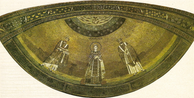 こちらも、”天上の楽園” といわしめる程、色彩、構図とも素晴らしい豪華絢爛なモザイクで装飾されていますので是非訪れてみて下さいね!(この教会のモザイクが作られたのは、パスカリス1世の教皇下なので時代はもっとずっと後の817~824年頃のことです。)