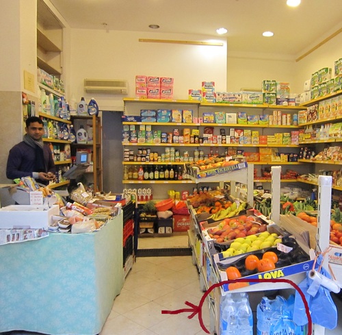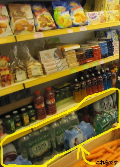 ↑ ローマの個人商店で。水は下記の黄色で囲ってあるところ。1本1リットル(もしくは1.5や2リットル)入りで、1本から買えます。 写真に写っているClaudiaやLete という水は硬水ですので、今日はお奨めしません。今後、硬水大集合!をします。