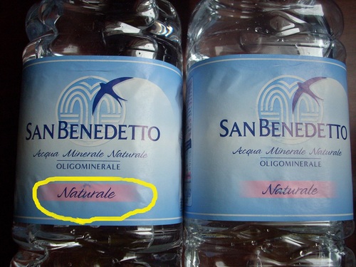 ↑ アリタリア航空などの機内でもサービスされている、サン・ベネデットのラベルです。 イタリアでは通常、お水にはガス入りとガスなしの2種類があります。