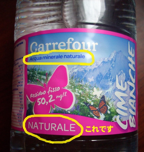 ↑ これはまた別のメーカーのペットボトルの例ですよ。カルフールスーパーのオリジナル商品です。ガスなしの例なのでご覧下さい。例のごとく Naturale と書いてありますね。