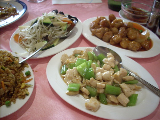 ↑ 手前は鶏肉とアーモンドの炒め物(ポッロ・アッレ・マンドルレ)3.8ユーロ。 右奥は、オーソドックスな酢豚で3.8ユーロ。そして、妙にキクラゲがたくましかった野菜炒め2.5ユーロ。普通に白いご飯も注文できます。