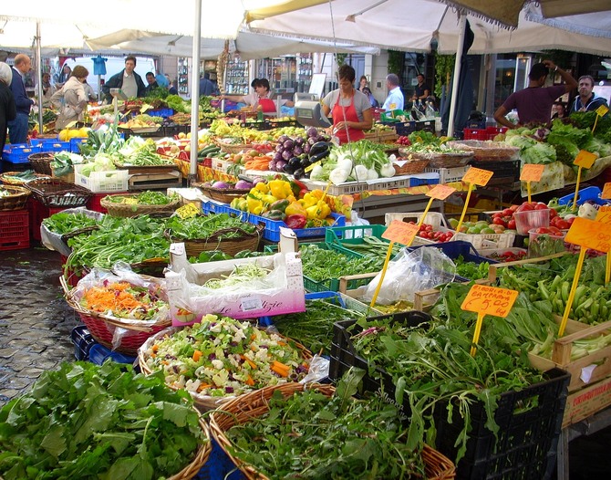 ↑ カンポ・デ・フィオーリ広場 (Piazza Campo de’ Fiori)の朝市。