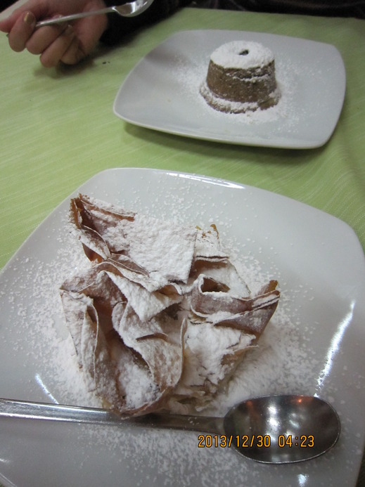 ↑ 選んだのはアップルパイ風のリンゴが詰めて揚げてあるデザートと、割ると熱々のピスタチオソースが中から出てくるスフレ。