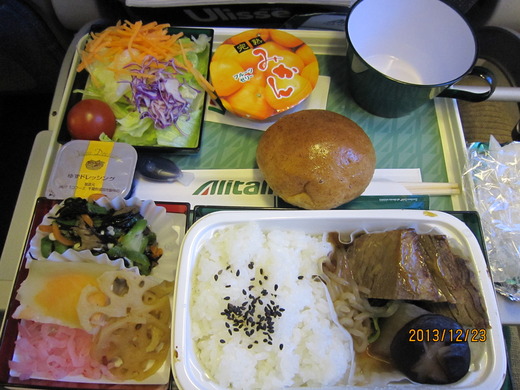 ↑ 上昇して水平飛行になると、最初のお食事(夕ごはん)が出ます。和食かイタリア料理から選べます。