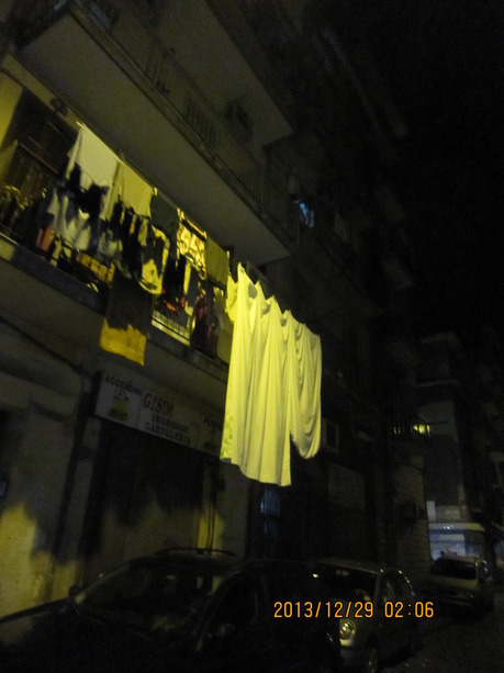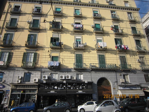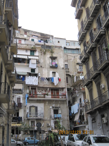 ↑ 建物もペンキはげはげで汚し。塗りなおさないのかな。スラム街の様な汚さです。(本当のスラム街とは比べ物になりませんが、あくまでイタリアの他の観光都市との比較として例えに出します)また、あちらこちらに洗濯物がビラビラ干されていて>この様な干し方はローマではありえないので、びっくり。生活臭プンプンの街です。