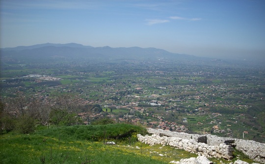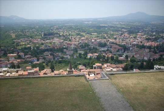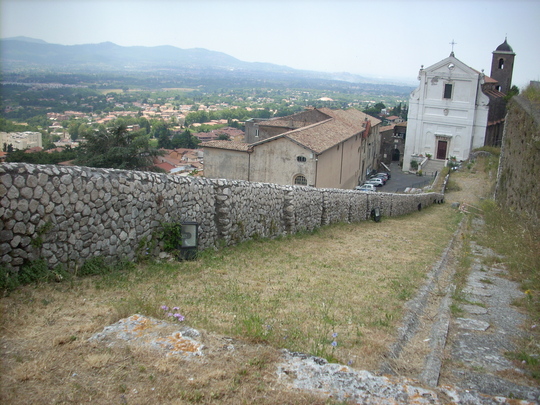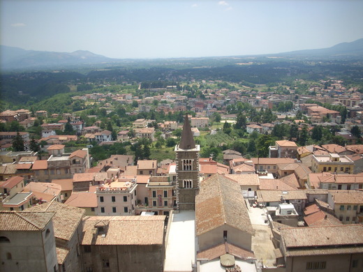 ↑ 神殿の最も高い部分より下の町を望む。写真中央の三角屋根がドゥーモ(サンタガピト)の鐘楼。 まずは町の中心にあるのは、一番大きく重要な教会、ドゥーモ(サンタガピト)です。レジーナマルゲリータ広場に位置していて、 この町生まれの聖人、アガピトに捧げられています。
