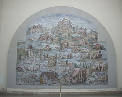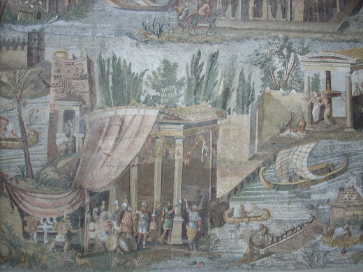 ↑ これが有名なナイル川のモザイクといわれる紀元前2世紀頃の作品。遠くから見ると絵のようにみえるかもしれませんが、大きな広間の床を飾っていた大きくて美しいモザイクですよ。