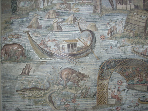 ↑ 細かすぎて見えない程一粒一粒がとても小さいモザイクでできていて、水辺に棲むいろいろな種類の動物が登場します。それにしても一つ一つ小さな石の色を変えて絵を描いていくなんてすごく気の遠くなる作業。床モザイクなので踏みつけられていたんですね。贅沢な床ですね~。 当たり前ですが、大昔からカバやワニはいたんですね~。ハスの花もあったみたいですね。屋台舟みたいなのを漕いでナイル川を渡っていたのでしょうか?